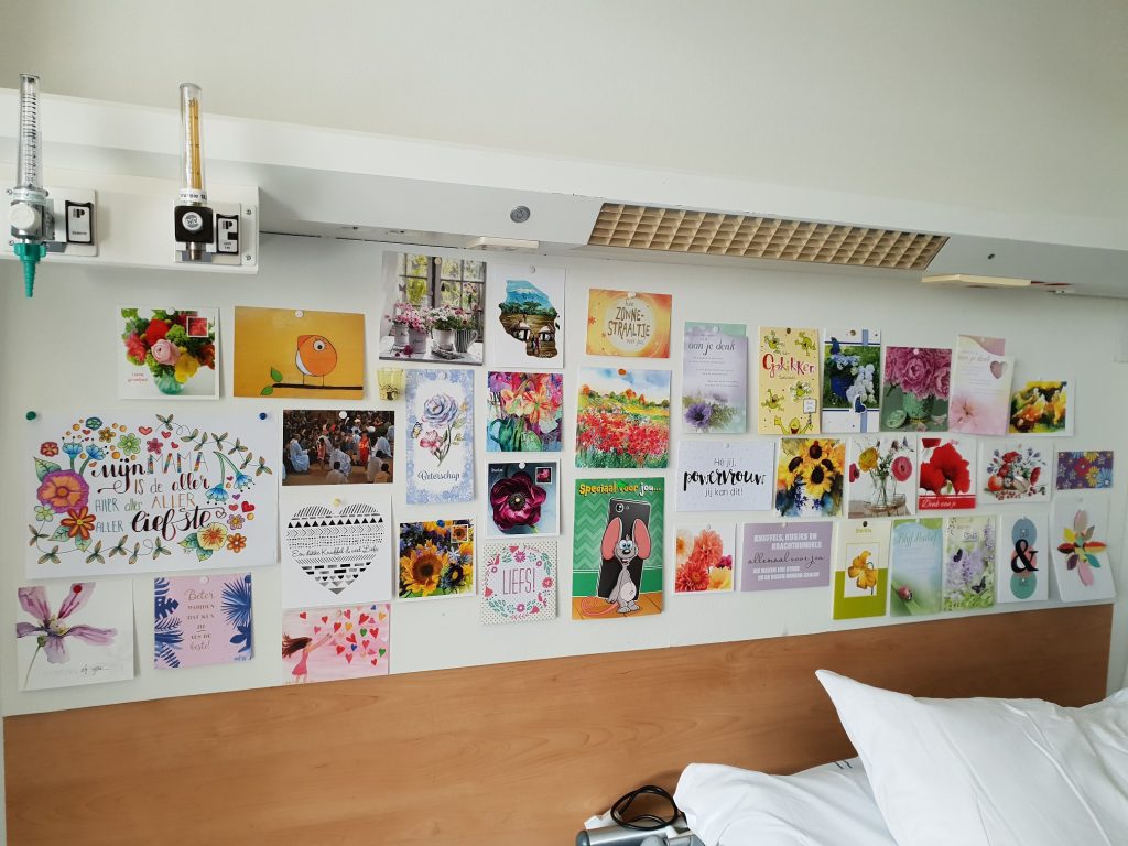 Deze editie van de blog is helaas een nogal somber verhaal. Geheel in Gea’s stijl sluit ik daarom af met enkele positieve opmerkingen. Gelukkig zijn er ook nog lichtpuntjes in deze voor haar zo duistere periode. Bij ieder bezoek van haar naaste familie fleurt ze weer even op. Voor zover dat mijn eigen bezoekjes betreft kan ik de credits niet volledig opeisen. Iedere keer neem ik namelijk kaarten, brievenbuspakketjes en dergelijke mee. Het uitpakken en lezen / bestuderen is telkens een feestje. Regelmatig worden we even stil van lieve en bemoedigende teksten. Verwondering is er over heel veel creativiteit. Uiteraard mogen er geen bloemen op de isolatiekamer, maar die prijken niet alleen op veel kaarten, er zijn ook uitvouwbare papieren boeketten en tegels met een boeket. Het doet ons heel veel goed, hartelijk dank daarvoor!